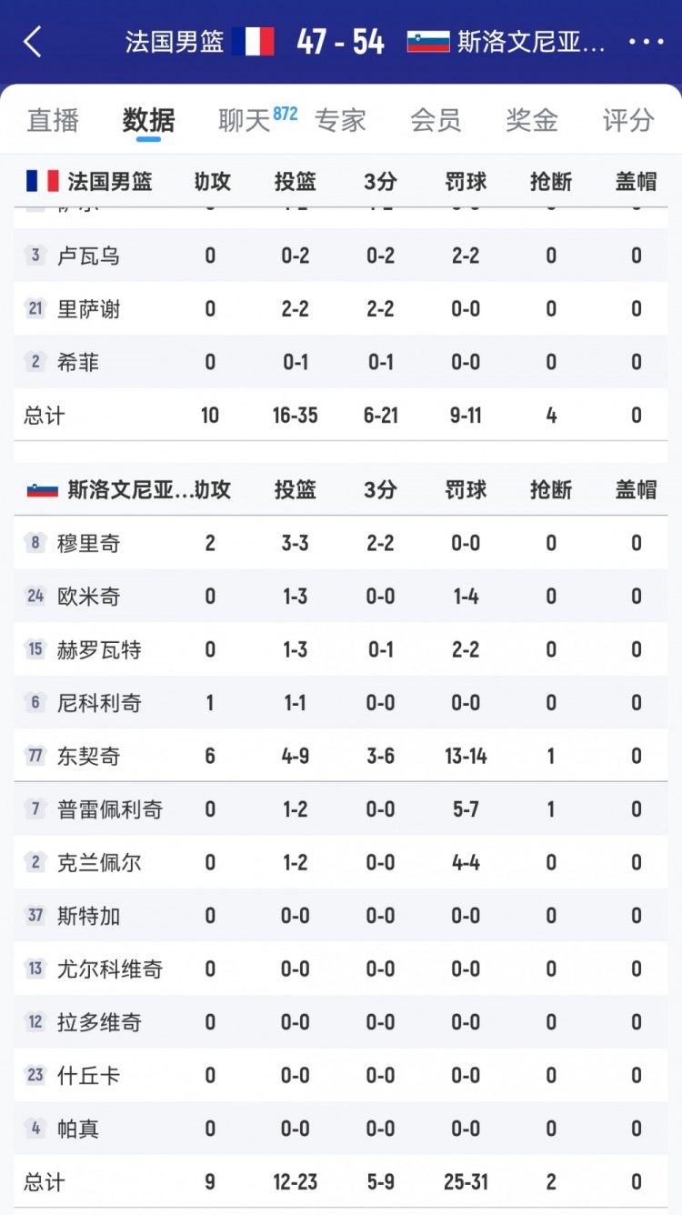 Đội bóng rổ nam, đội bóng rổ nam Slovenia đã dẫn đầu đội bóng rổ nam người Pháp 54-47 vào giờ nghỉ giải lao.