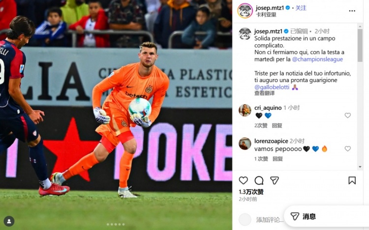 Trong vòng này của Serie A, Inter Milan đã đánh bại Cagliari 2-0. Trong trò chơi này, thủ môn Nerazzurri Josep Martinez đã bắt đầu.